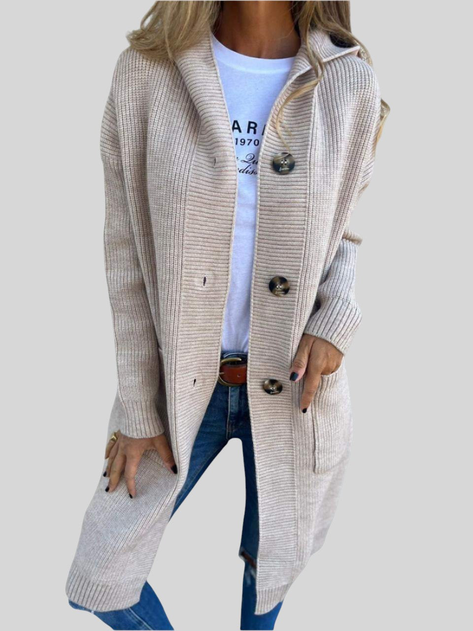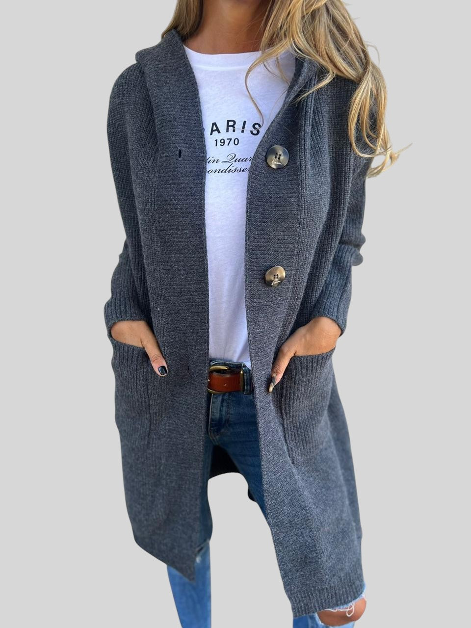 С това дълго, стилно плетено палто можете да добавите уютен и функционален вид към ежедневния си гардероб. Модерният дизайн и меката плетка добавят чар към всяка визия, а дългата кройка осигурява комфорт и елегантност.