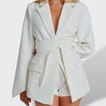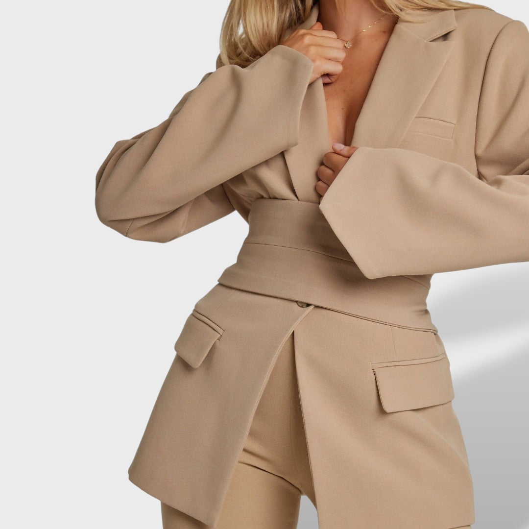 Това женско сако с колан съчетава класически дизайн с модерен акцент, който подчертава фигурата ви с елегантност. Неговият прилепнал кройка и чисти линии предават sophistication, идеално както за формални среди, така и за ежедневни стилове с характер. Достъпно в черно, бежово, бяло и сиво, то е вечна част, перфектна за есен-зима 2025.