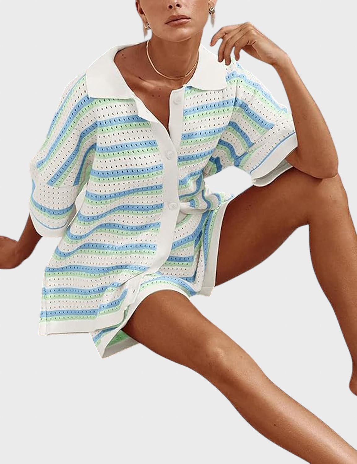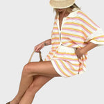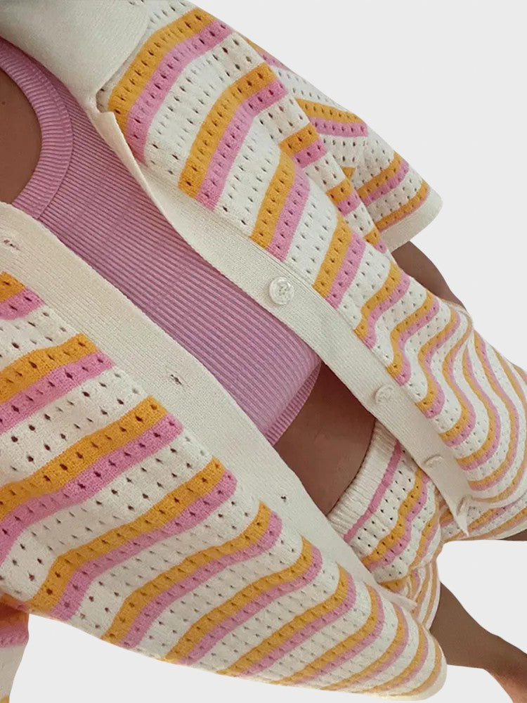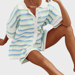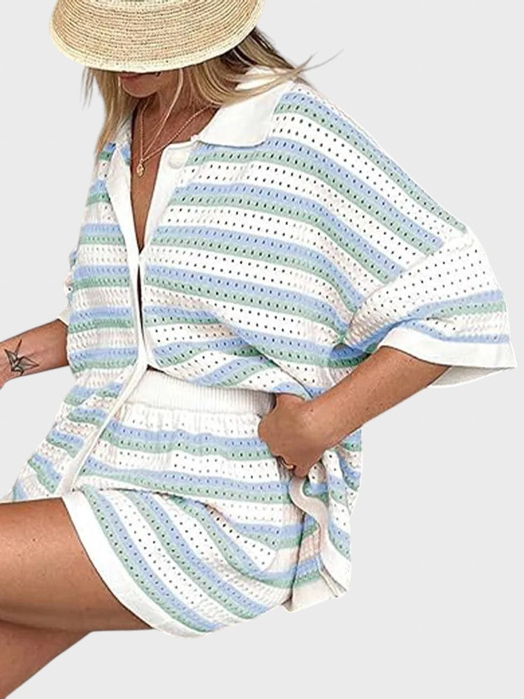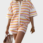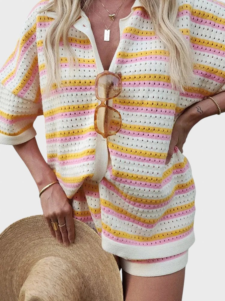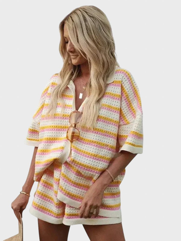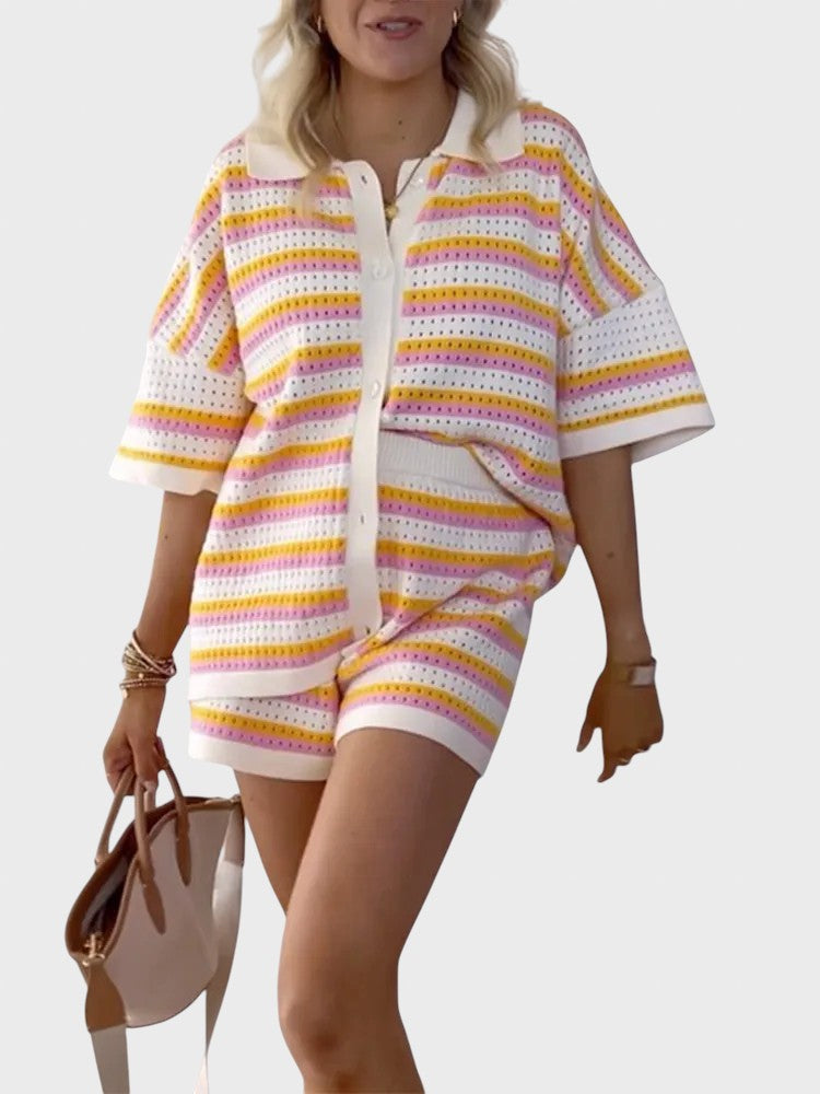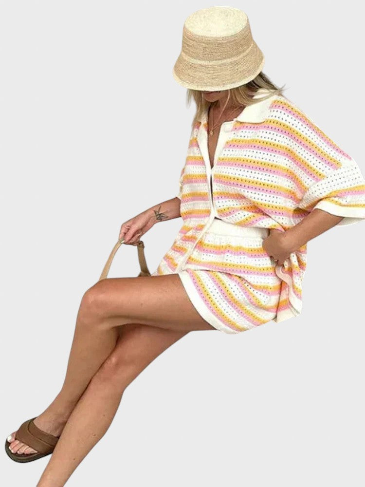 Със своя летен дизайн и дишаща материя, този комплект добавя слънчево излъчване към всеки повод. Този комплект е не само стилен, но и невероятно удобен, идеален за всеки повод. Независимо дали отивате на плаж, обядвате с приятели или се разхождате из града, този комплект предлага удобно прилягане и безспорно модерен стил.