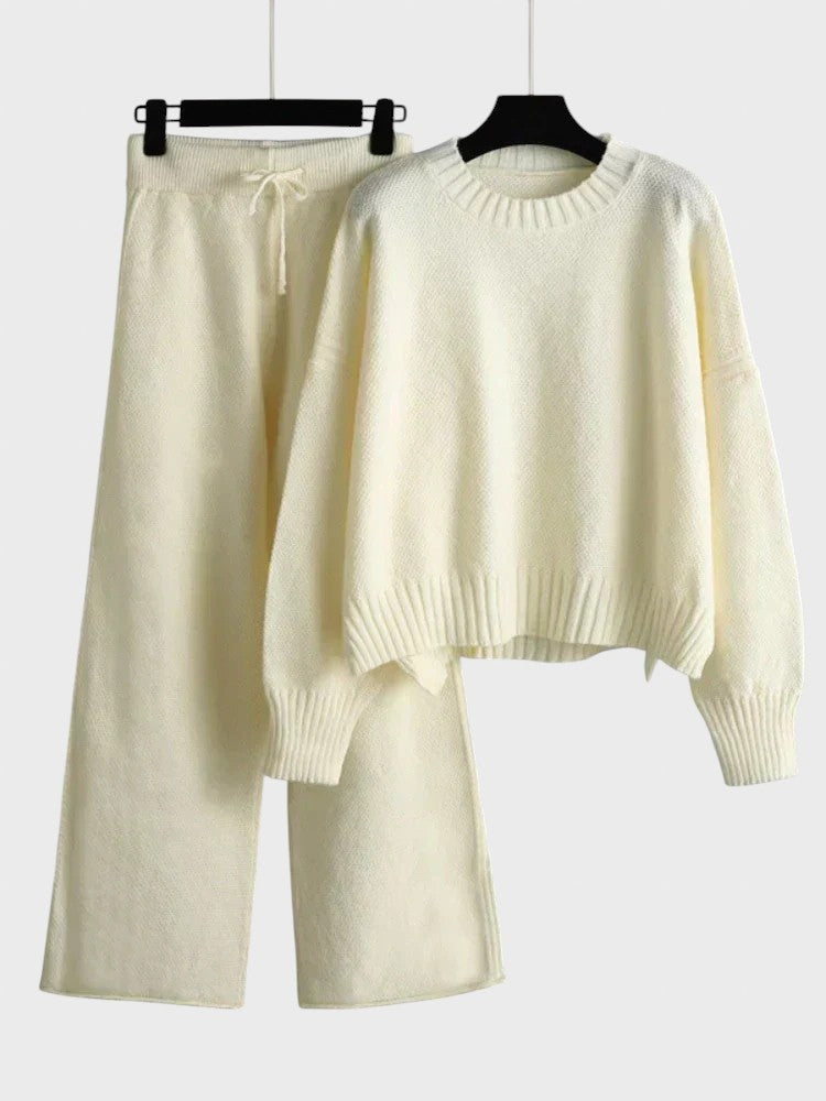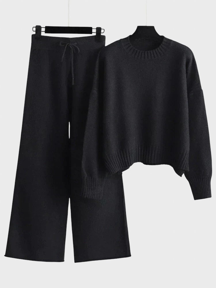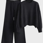 • Модерен оверсайз силует: Пуловерът има квадратна, леко къса кройка, контрастираща перфектно с широките панталони. Този баланс на обем придава на облеклото много модерен, изискан и ласкателен вид.