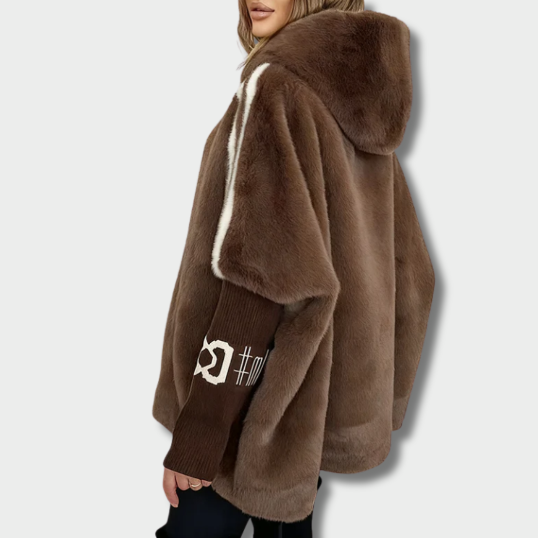 Пуловерът Николина е изработен от ултрамек плюш с интегрирана качулка и контрастни ръкави от плетен плат, създавайки хармонично съчетание между комфорт и модерен дизайн. Свободната кройка гарантира, че лесно се носи върху други слоеве, а подбраните текстури правят този модел идеален за прохладни есенни и зимни дни.