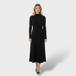 Тази рокля от 100% мерино вълна съчетава топлина, стил и комфорт. Дизайнът с фалшива висока яка и V-образно деколте с дълги ръкави предлага изискана силуета, идеална за студените месеци.