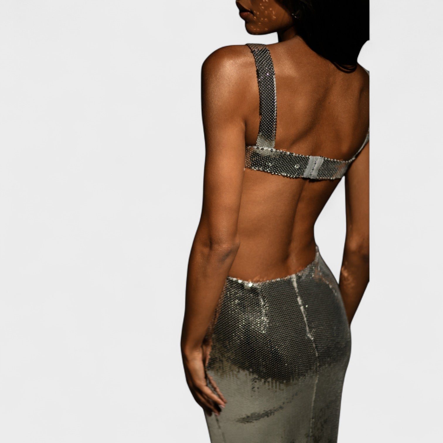 Роклята Киара привлича вниманието от първия момент. Нейната тъкан от блестящи пайети отразява светлината с елегантност, докато страничните разрези оформят силуета със sensuality. Проектирана за жени, които се осмеляват да блестят в всяка стъпка.