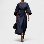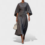 Рафинирана дълга рокля с лодка и обемисти ръкави изгражда изискана, архитектурна силует. Широкият колан подчертава талията, докато разкошната падаща пола позволява свобода на движението и грациозна походка. Минималистичните детайли и чистите линии я правят идеален избор за тържествени поводи, бизнес събития и вечерни излизания.