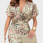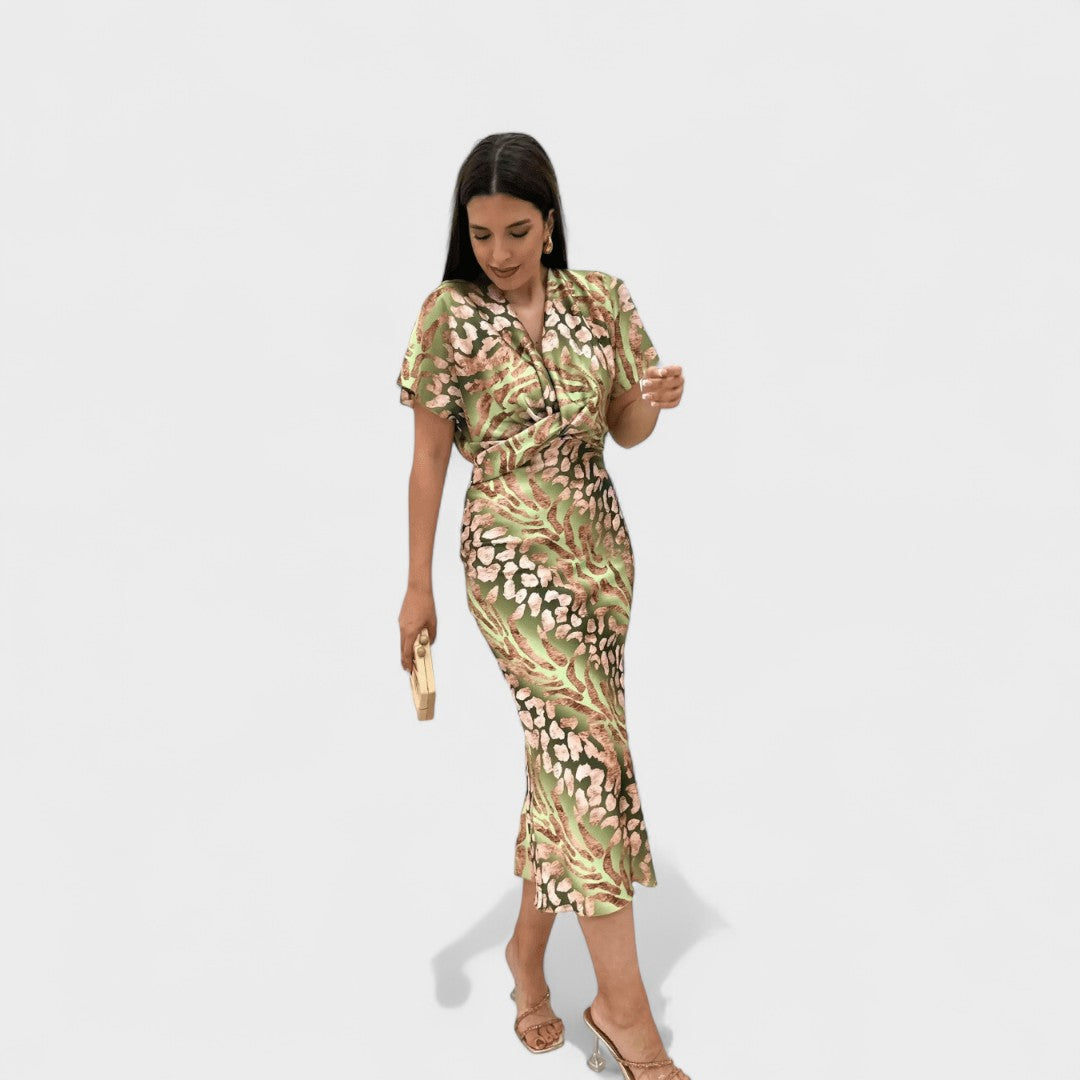 Софистицирана миди рокля с ефирни ръкави и драпирано V-образно деколте, което нежно подчертава деколтето. Тъканта с изискан блясък и декоративен мотив елегантно пада върху тялото, докато дефинираният талия оформя женствена силуета. Завършекът, който леко се разширява, позволява грациозно ходене — идеално за сватби, коктейли и всякакви специални поводи.