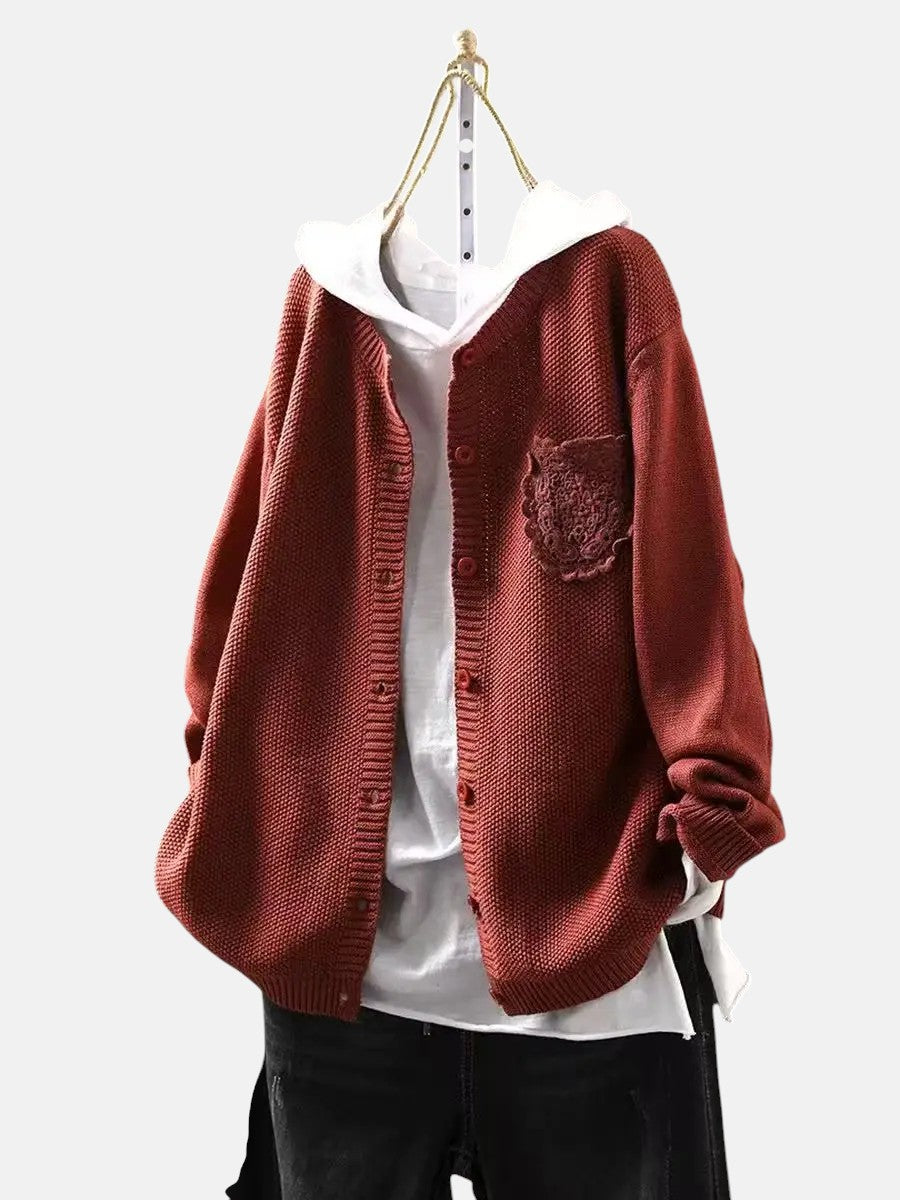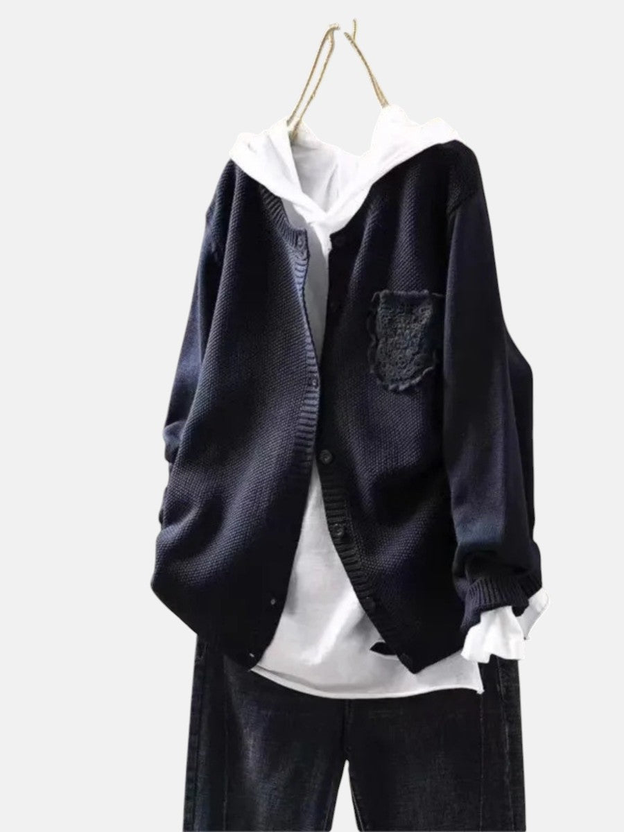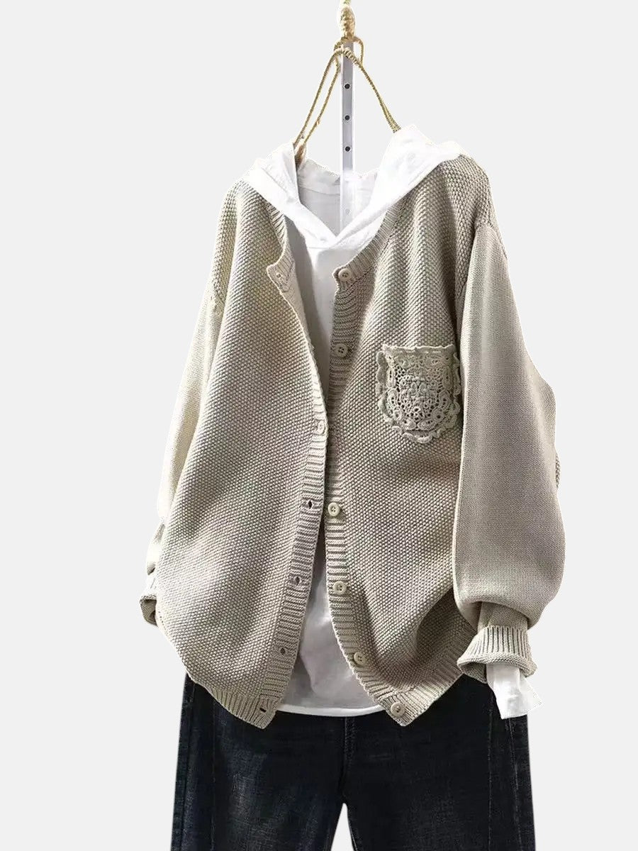 Уютният кардиган и идеален за жени, които ценят комфорта с нотка елегантност. С меко драпирана силует и деликатни дантелени джобове, той предлага изтънчен слой, перфектен за спокойни утрини и неофициални събирания.
