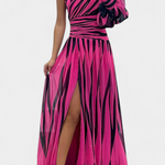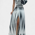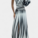 Рокля, която превръща простотата в стилно изявление. Валентина комбинира привлекателността на асиметричния дизайн с едно рамо и модел на меки райета, които удължават фигурата и придават динамика. Лека, флуидна и пълна с присъствие, идеална е за поводи, когато искате да подчертаете елегантността без усилие.