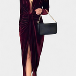 Очарователна силуетка, която комбинира сексуалност и вечна елегантност. Вилма се отличава с дълбок V-изрез, който удължава фигурата, дълги ръкави, които балансират дизайна, и преден разрез, който добавя динамика и смелост. Златният завършек усилва нейния магнитен характер, правейки я парче, замислено да блести на всяка възможност.