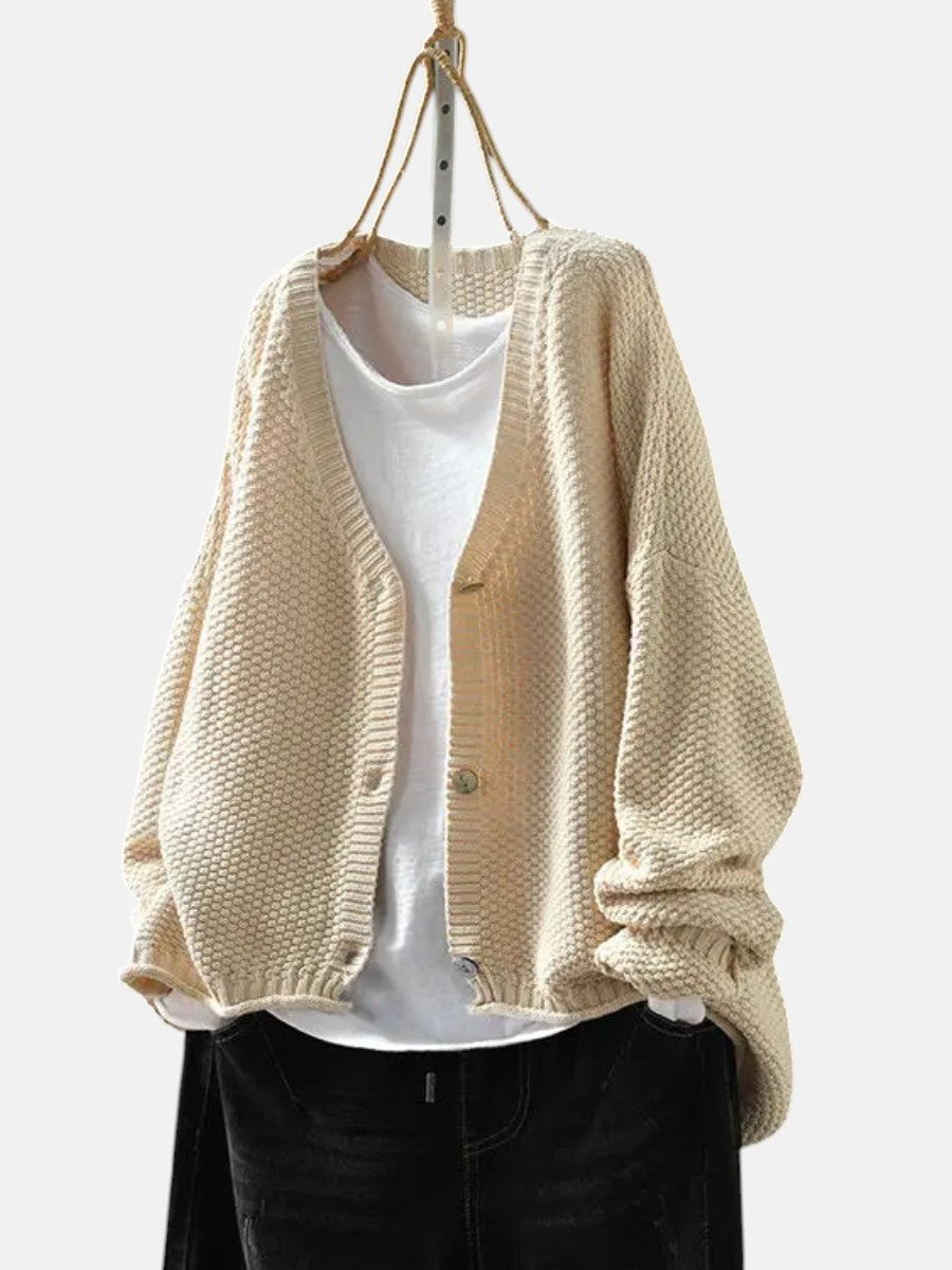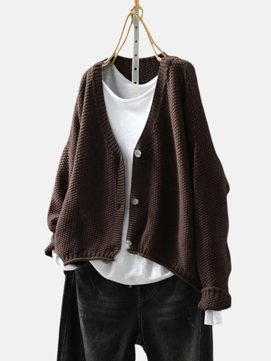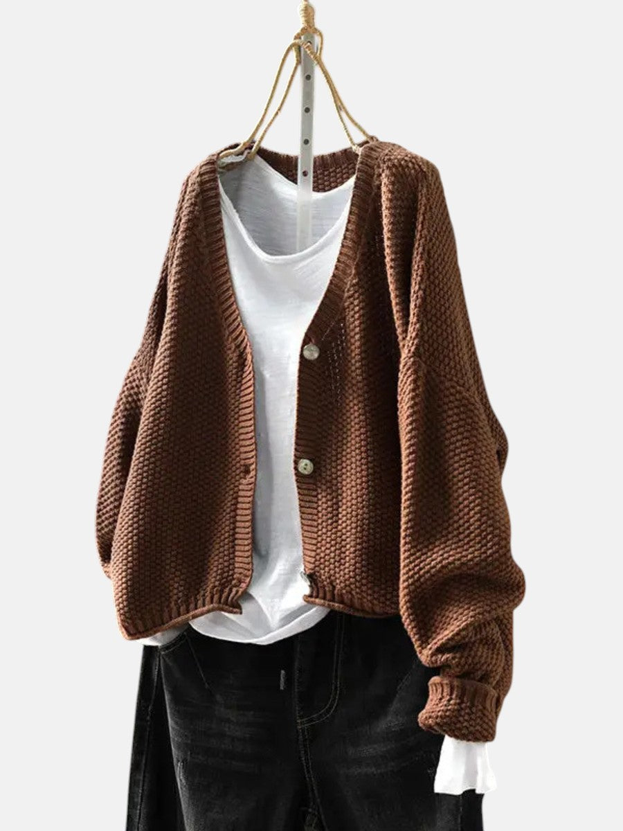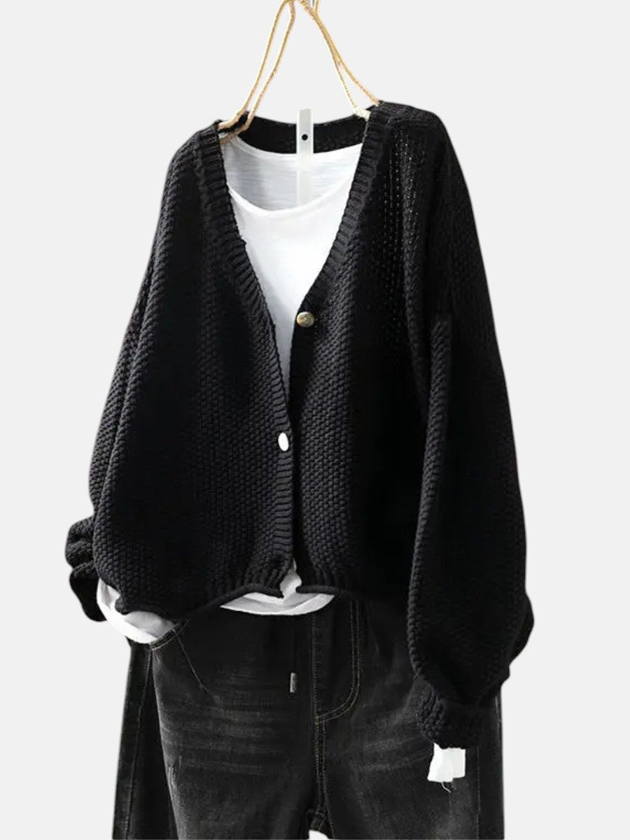 Плетеният кардиган Корали е идеалният лек, но уютен слой за всекидневно носене. Със своята мека плетена материя, свободен силует и V-образно деколте, той е перфектен за ветровити пролетни сутрини и хладни есенни вечери.