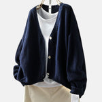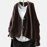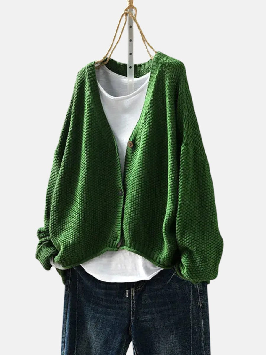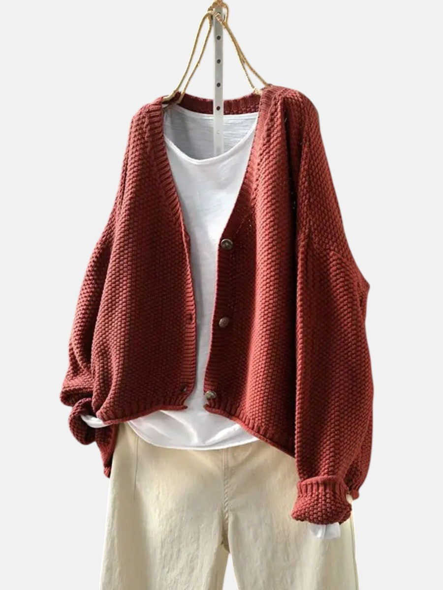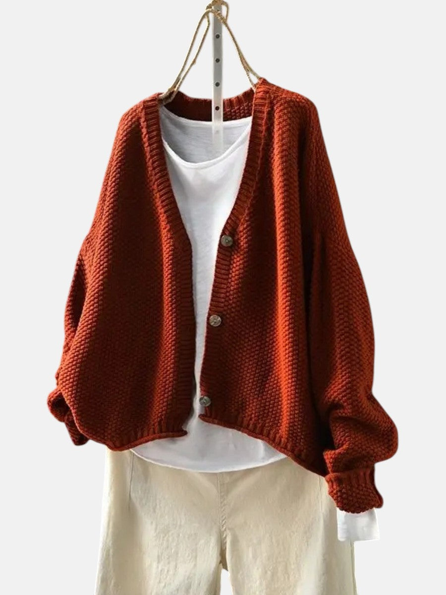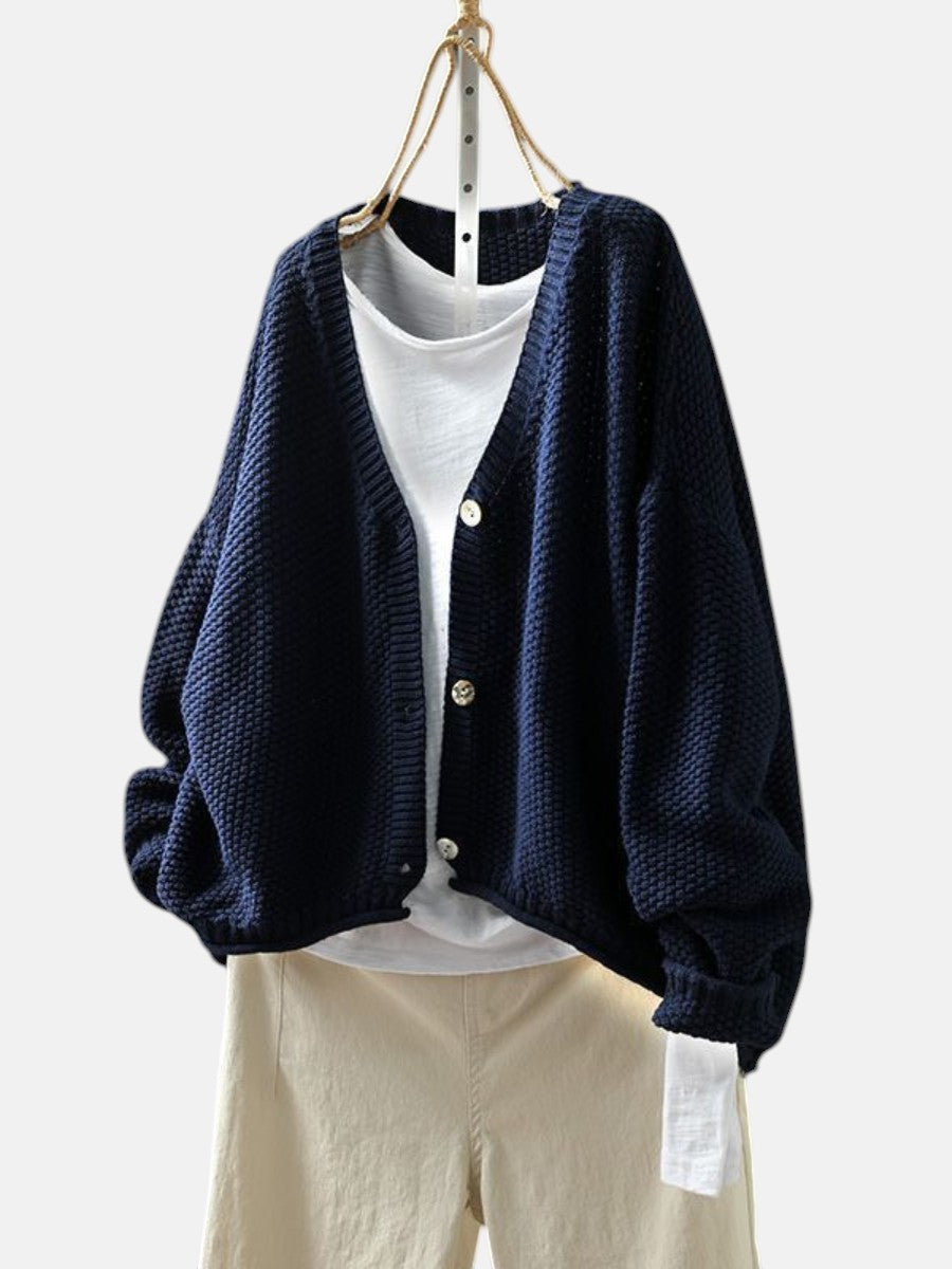 Плетеният кардиган Корали е идеалният лек, но уютен слой за всекидневно носене. Със своята мека плетена материя, свободен силует и V-образно деколте, той е перфектен за ветровити пролетни сутрини и хладни есенни вечери.