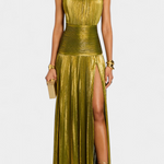 Скулптурен гламур с магнитна енергия. Роклята Бояна очарова със своя металик завършек в нюанс перидот и силует, който тече с мощ и елегантност. Нейният дефиниран халтер изрез, открит гръб и подчертан разрез създават перфектен баланс между структура и движение.