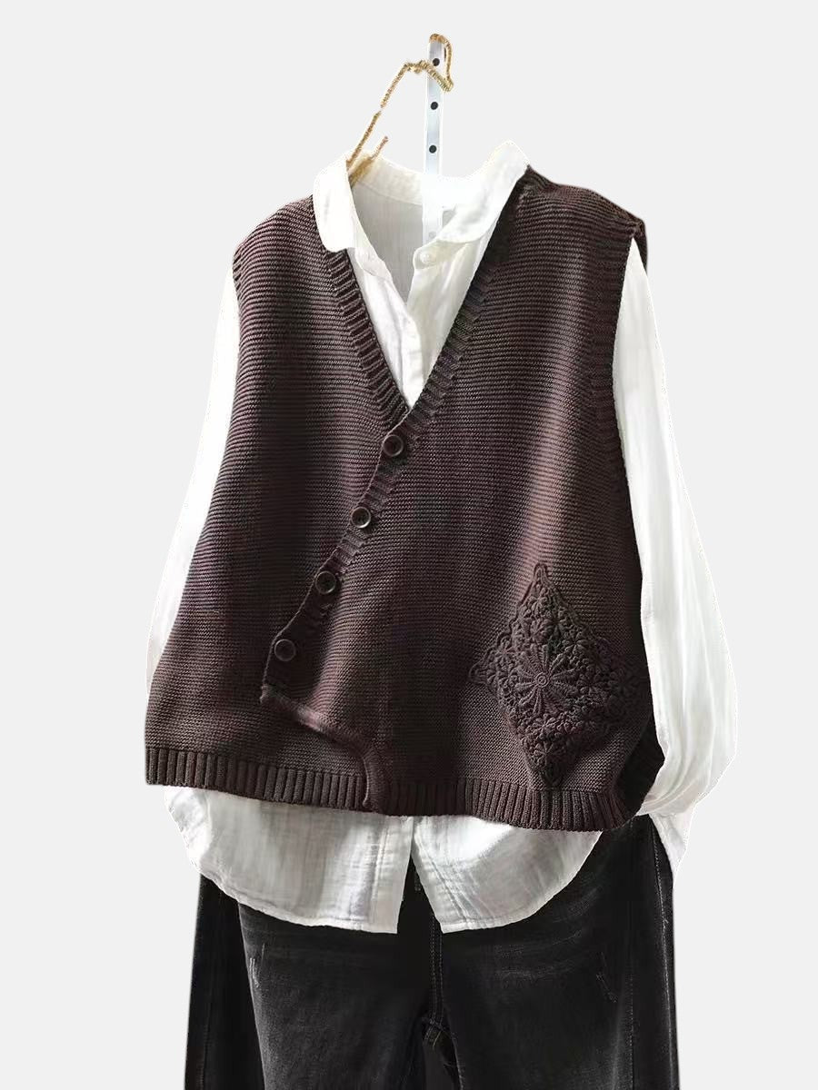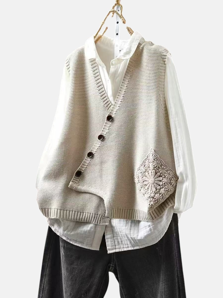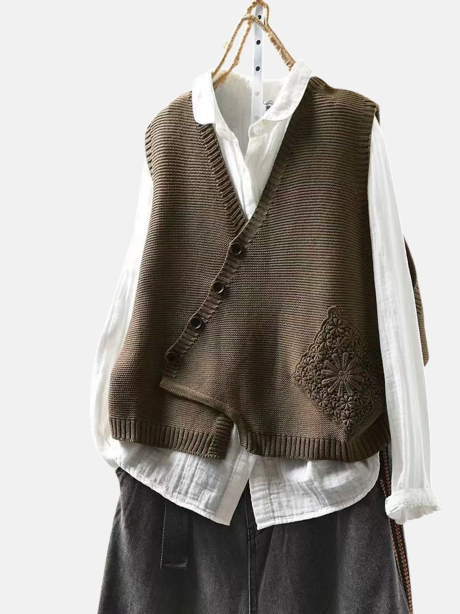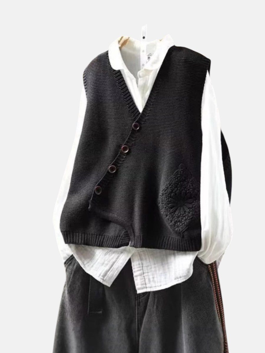 Плетеният жилет Elowyn е елегантно облекло, проектирано за жени, които ценят сдържаната изтънченост. С меката си плетена текстура и асиметричен преден бутон, този жилет добавя чар и удобство към всяка визия.