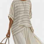Свободен и с естествен чар, комплектът Дейзи съчетава райета тениска с меко кроене и летящи панталони с широки крачоли. Изработен от ленен бамбук, предлага свежест, нежна текстура и движение, идеален за слънчеви дни на плажа или спокойни разходки из града.