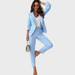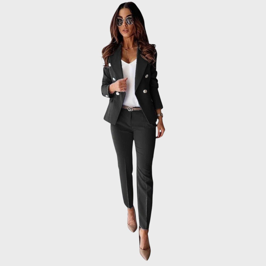 Божена дамско сако олицетворява класическа изтънченост с модерен привкус. Двуредният дизайн на сакото с елегантни метални копчета и перфектно съчетани панталони създават остър, изразен вид, който излъчва самочувствие и елегантност. Независимо дали в офиса, на бизнес срещи или на вечерни тържествени събития – Божена гарантира безупречен силует и изискана присъствие.