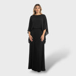 Тази макси рокля с прилепи съчетава елегантност и комфорт в една дреха. Нейната течна материя и плисирен дизайн създават силует, който се адаптира с грация към всяко движение, докато високият врат добавя изтънчен и съвременен акцент. Идеална е за нощни събития или формални тържества, където дискретният стил прави разликата.