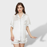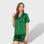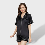 Комплектът Елена™ от 2 части е проектиран да предлага удобство и свежест, идеален за почивка у дома или сън. Включва къс ръкав топ с яка, декоративни кантове и преден джоб, придружен от къси панталони с релаксиран кройка. Наличен в широка гама от цветове, този пижама съчетава стил и комфорт, идеален за жени от всички възрасти и поводи.