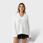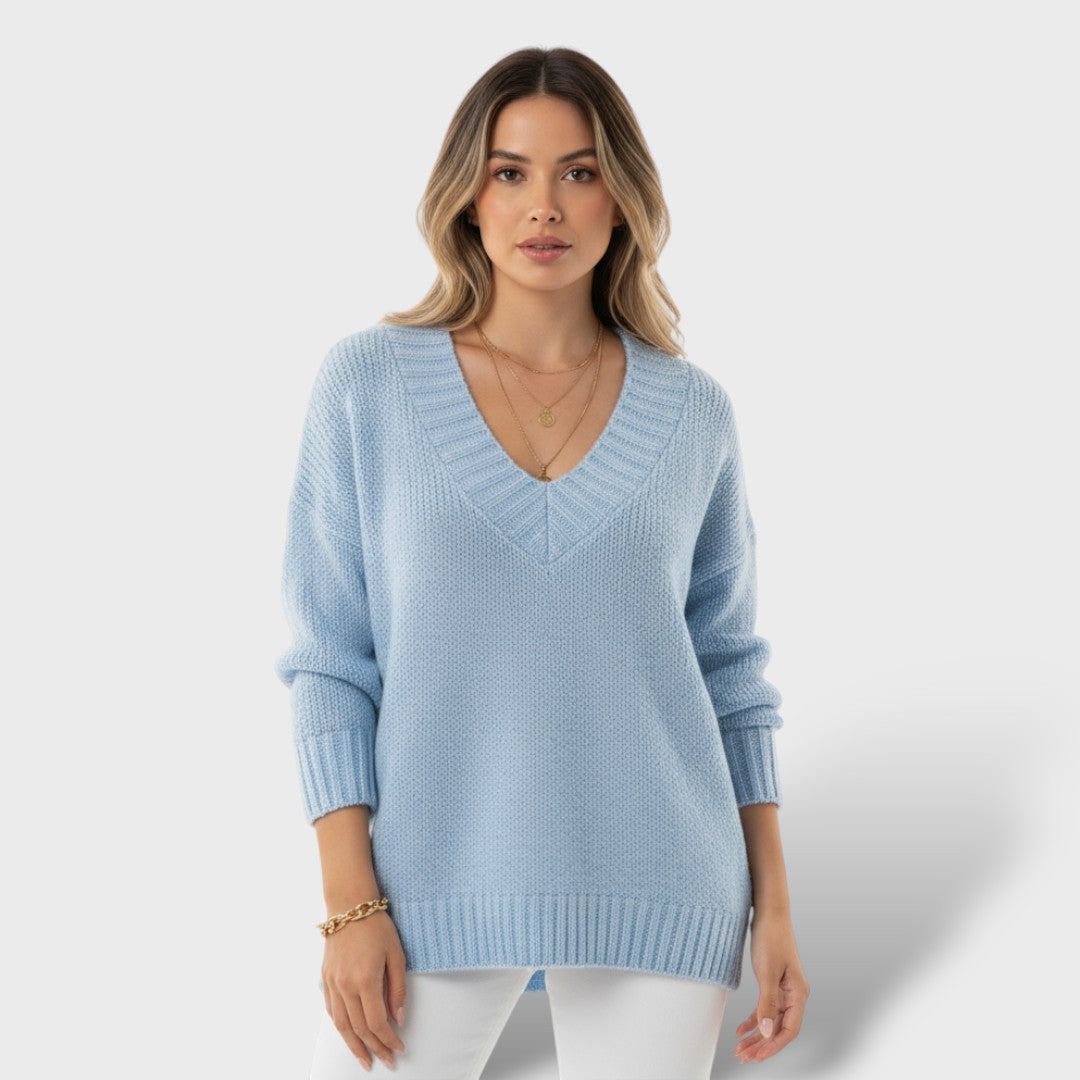 Този мек пуловер с V-образно деколте предлага перфектната комбинация между комфорт и изискан стил. Неговата лека текстура и благоприятен кройка го правят универсално и извънвремево облекло, идеално както за носене самостоятелно, така и за наслагване с ризи или якета. Елегантна основа, която добавя топлина и изтънченост без усилие.