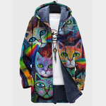 Импозантен джъмпер с качулка, който се отличава благодарение на артистичния модел на котки в интензивни и живописни цветове. Комбинира удобство с креативност, правейки го перфектен избор за тези, които обичат стил с личност.