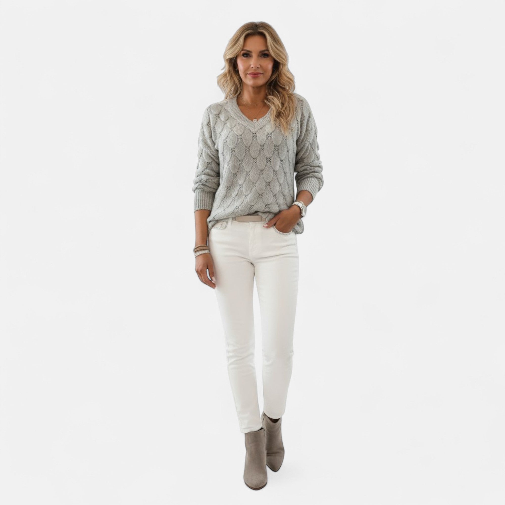Пуловер Ноемие за жени с V-изрез въплъщава безгрижна елегантност и извечен комфорт. С ласкав V-изрез и небрежен крой, този пуловер предлага перфектна комбинация от стил и удобство. Независимо дали е за ежедневие, офис или неформални излизания през уикенда – Ноемие винаги е правилният избор.