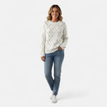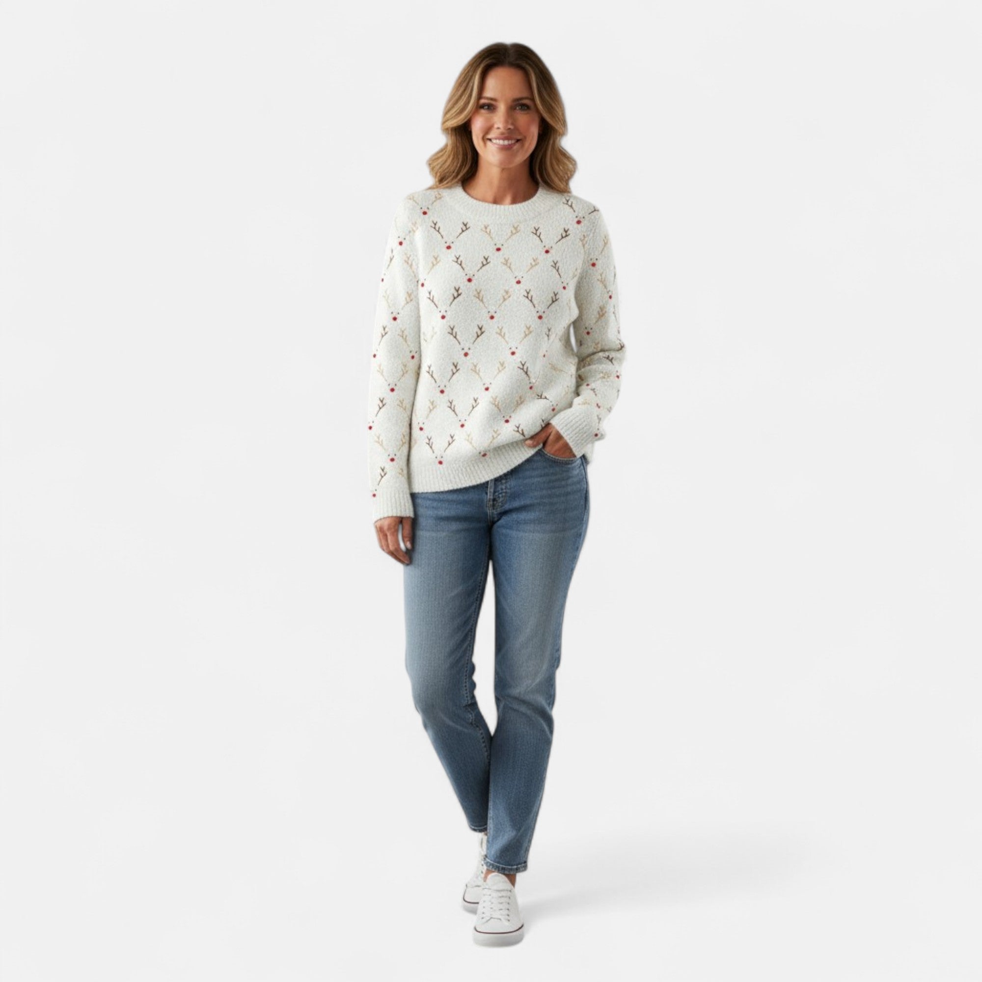 Това е зимен пуловер за жени! Изработен от мек, висококачествен материал, този пуловер предлага топлина и стил на вашия гардероб. С чаровния си зимен дизайн, осигурява удобен вид и е перфектен избор за студените дни – било на работа, по време на коледните пазарувания или за релаксиращи уикенди.