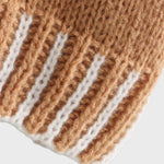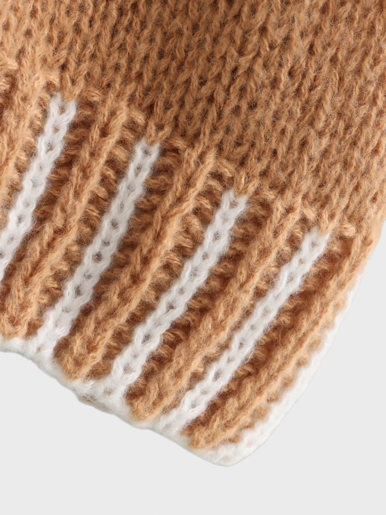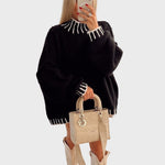 • Класическа и елегантна кройка: Пуловерът е с оувърсайз дизайн за свободна и удобна кройка. Детайлите добавят нотка елегантност: високата яка, контрастните бели райета на маншетите и подгъва, както и широките балонни ръкави, подсилват обемната, модерна естетика.