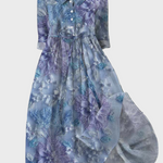 Тази дълга рокля в нюанси на лавандула и синьо комбинира романтика и елегантност. Нейният специален цветен десен с цветя добавя щрих свежест, докато леката силует я прави идеална за пролетни и летни поводи.
