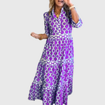 Тази риза-рокля съчетава класика и съвременен дизайн. Благодарение на кроя с яка и копчета, излъчва елегантност, докато впечатляващият десен придава динамичен и модерен вид. С три четвърти ръкави и акцентиран талия, предлага женствена силует и комфорт през целия ден. Идеална за работа, градски разходки или вечерни излизания.