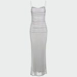 Впечатляваща макси рокля с тънки презрамки и дантелени детайли на деколтето. Нейната тясна силуетна форма подчертава извивките, докато прозрачната материя в долната част придава въздушна елегантност. Идеална за вечерни излизания и специални поводи.