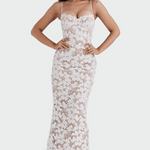 Елегантна макси рокля от дантела с цветен десен, която подчертава женствеността с елегантност и вечен стил. Тънките презрамки и прилепналият крой обгръщат силуета, правейки я идеална за вечери или специални поводи. Прозрачната текстура на дантелата придава усещане за лукс и романтика.