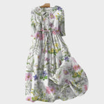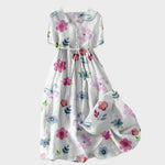 Дълга рокля с къси ръкави съчетава непринудения характер на риза с романтичен обем на полата. Яката с фин ръб и редицата копчета придават изискан вид, докато връзката в талията лесно адаптира прилягането. На gathered полата създава плавен спад, който красиво следва всяка крачка. Изработена е от лек, въздушен материал, приятен на кожата, така че е идеална за разходки из града, излети и всички неформални поводи.