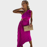 Набръчканите рамена придават на тази рокля изискан и бляскав вид. Идеална е за специални поводи, когато искате да подчертаете своята изтънчена страна.