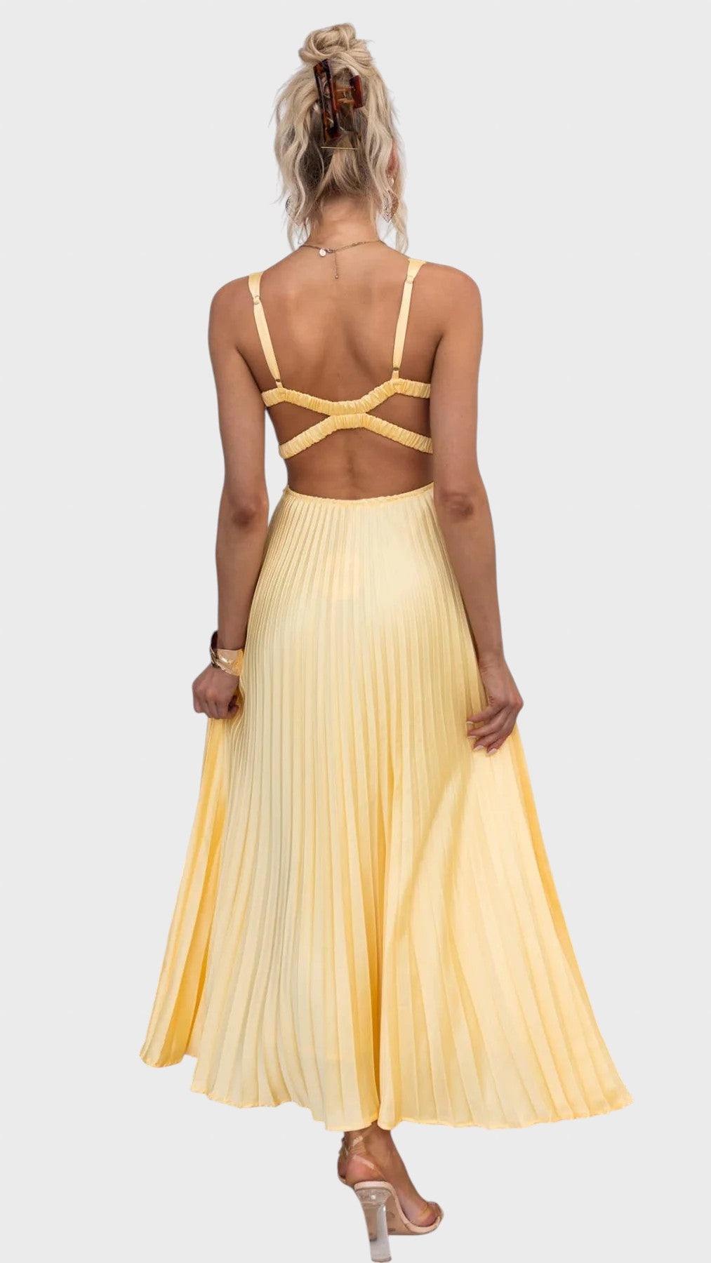 Нека елегантността се срещне с вечния чар с нашата зашеметяваща елегантна плисирана рокля. Тази дреха е олицетворение на модерната изтънченост, съчетаваща структуриран дизайн с нотка на класическа женственост.