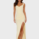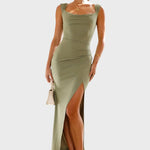 • Квадратно деколте и структурирани презрамки: Квадратното деколте е модерна класика, предлагаща нотка на изтънченост и поддръжка. Широките, леко набрани презрамки осигуряват структурен детайл, който балансира плавността на роклята.