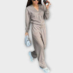 Този комплект е перфектният избор за тези, които търсят стил и практичност в едно. С правия крой на панталоните и палтото с големи копчета и класически вид, съчетава удобството на небрежния стил с изисканост, идеална за различни поводи — от работа до излети. Модерен, удобен и винаги елегантен вид.