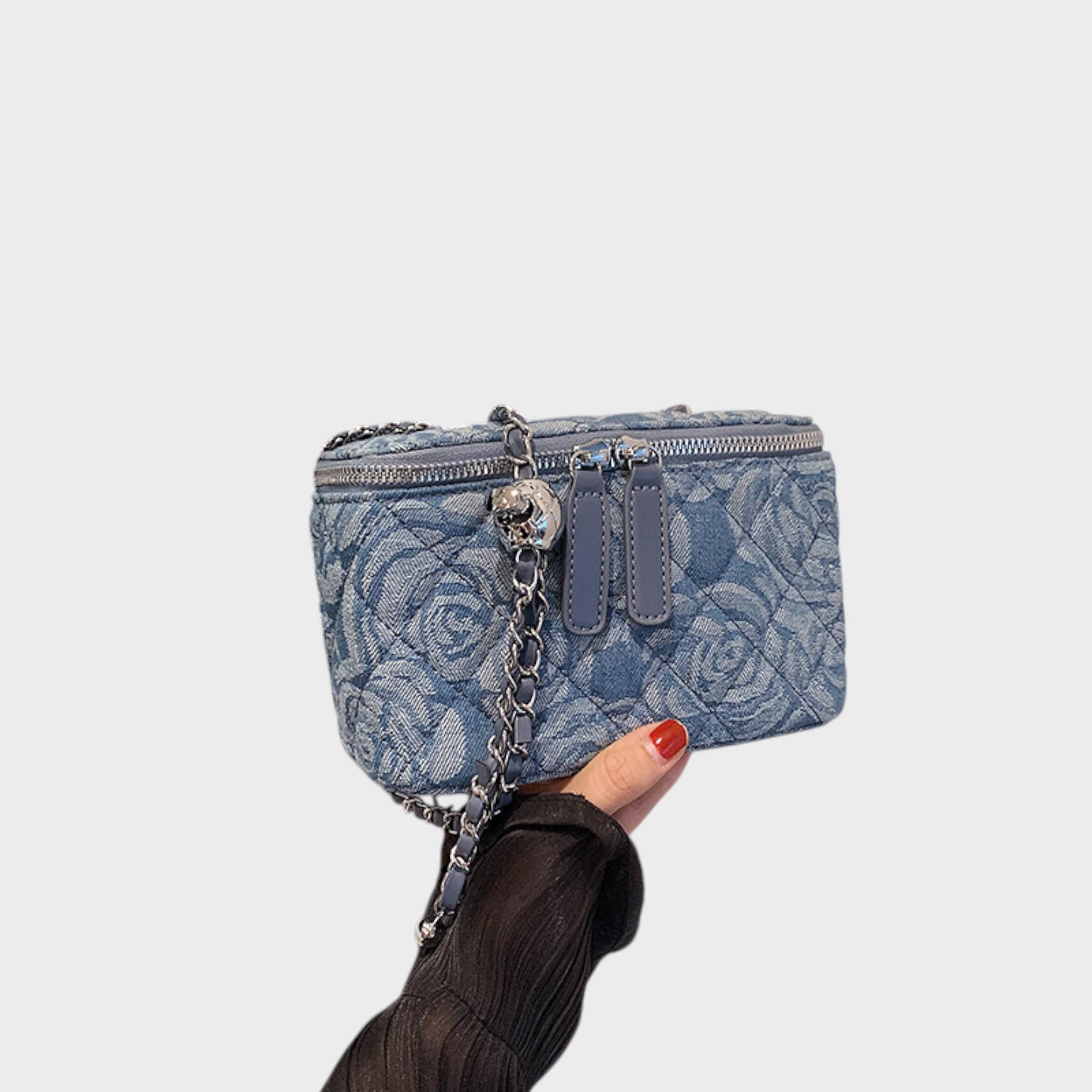 Тази чанта е перфектният избор за тези, които обичат стил с романтичен нюанс. С релефен цветен мотив и изискан текстилен завършек, тя носи лек, креативен и женствен вид. Нейната структурирана форма и дръжка с верига придават баланс между небрежност и елегантност, правейки я уникален аксесоар, който подчертава вашата личност при всяка повода.