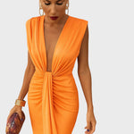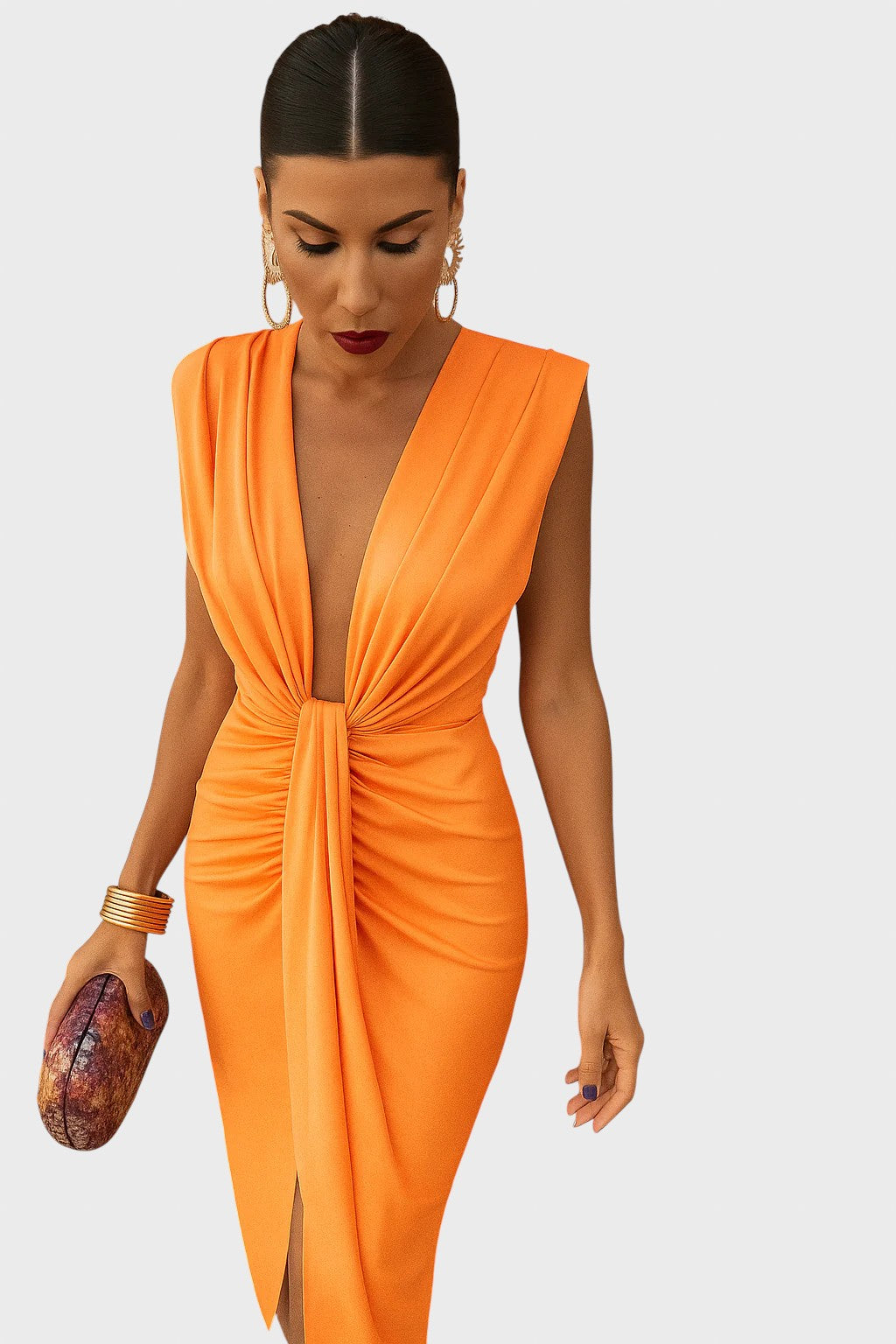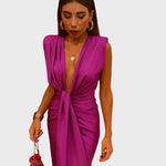 Тази рокля без ръкави макси съчетава простота и модерен стил в едно цяло. Акцентът ѝ е драматичната предна драперия, която се среща и стяга в центъра, създавайки богата, течна текстура. Този детайл не само красиво очертава талията, но и подчертава дръзкото дълбоко V-образно деколте, балансирано от фино структурирани рамене.