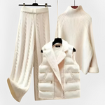 • Луксозен комплект за съчетаване (3 в 1): Това е цялостно решение за стилизиране на всичко. Включва плетен пуловер с оребрена яка , плетен панталон с широки крачоли и ватиран жилет с детайл от изкуствена кожа. Всички кремави артикули предлагат изключително изтънчен монохромен вид .